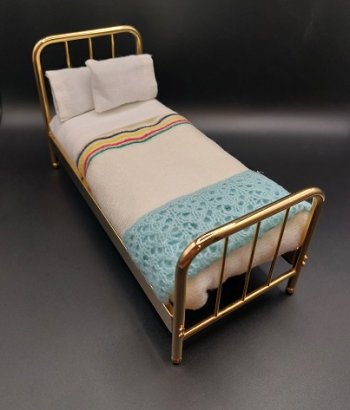 Twin Brass Bed by Clarebell is dressed by Artisan Mary Agnes with white sheets and 2 white pillows, white flannel blanket with purple, yellow, red, and green stripe at top as well as a blue crochet blanket at foot of bed