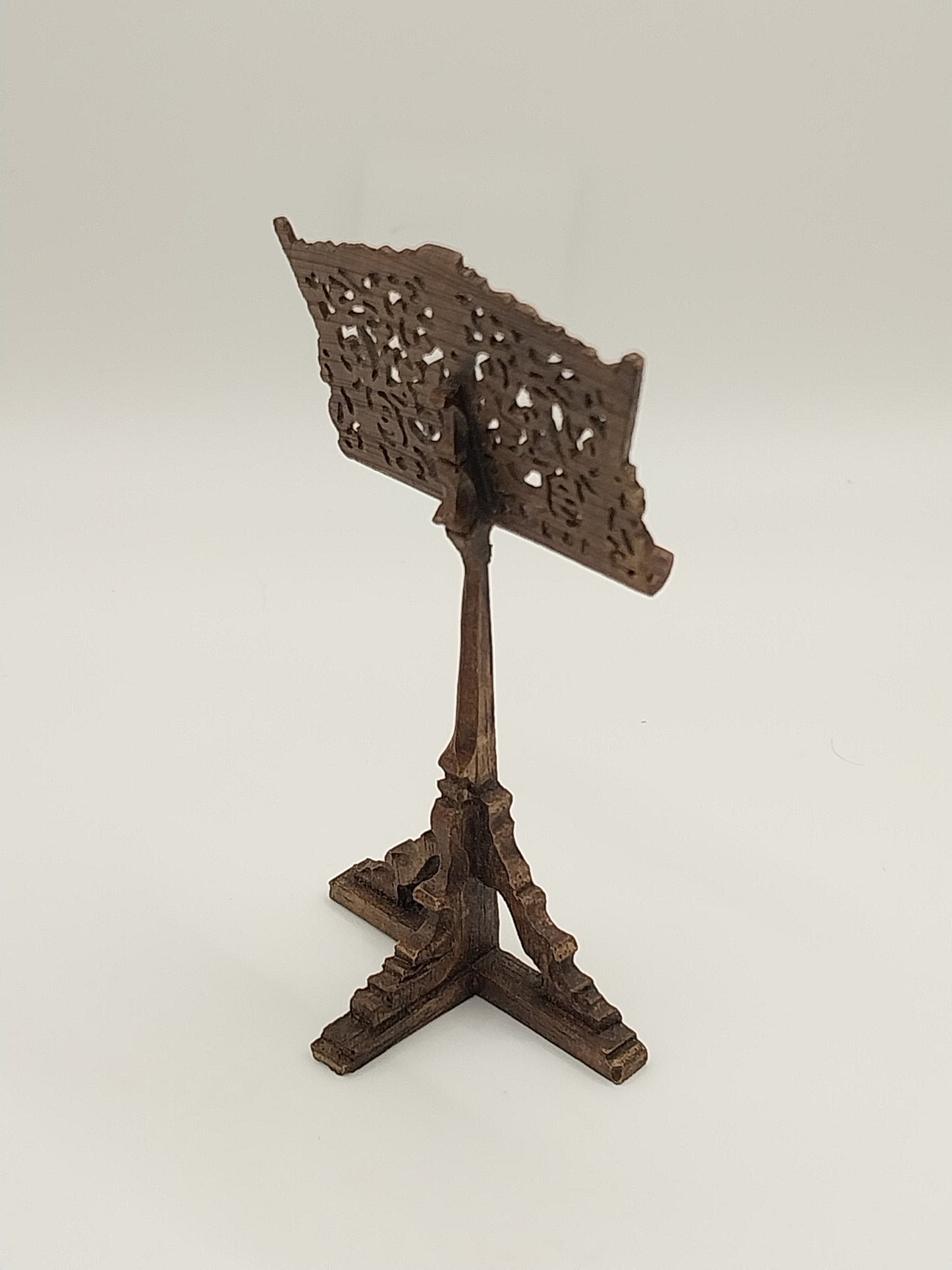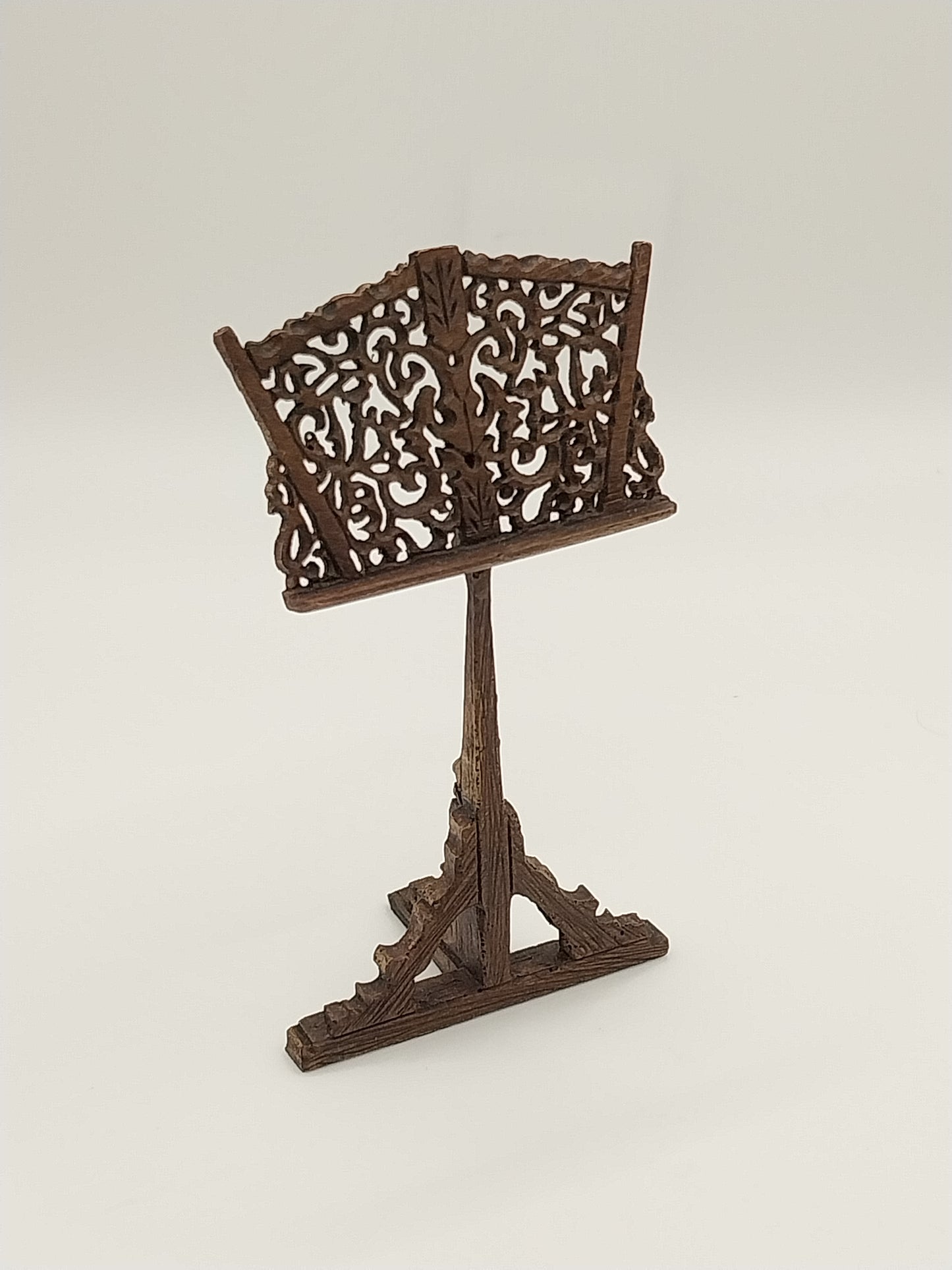 Very rare carved fretwork Victorian music stand with ledge to hold music. This was crafted by Geoffrey Bishop shortly before he retired and purchased. Mr. Bishop created an exact replica of a stand he saw in a museum, right down to the incredible arrow carved along the center of the stand. Signed but it is difficult to read.