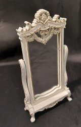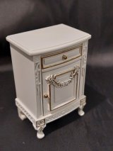 This 6 piece Victorian Bedroom Set comes in a Light Gray finish with gold accents on intricate embossed carved wood. Set includes Bed, Mirrored Armoire, Vanity Table with Chair, Mirror, and night stand. Armoire has 3 mirrored doors that open up to shelving on either side and closet in center.