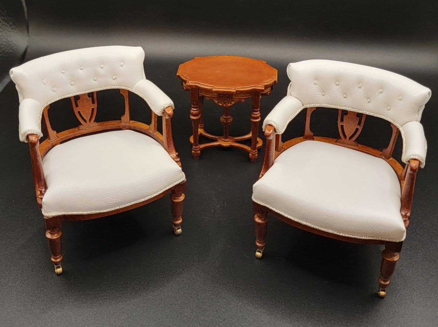Size: Chairs-2-1/2"W x 1-7/8"D x 3-1/8"T Side Table-2-1/8"W x 1-9/16"D x 2"T