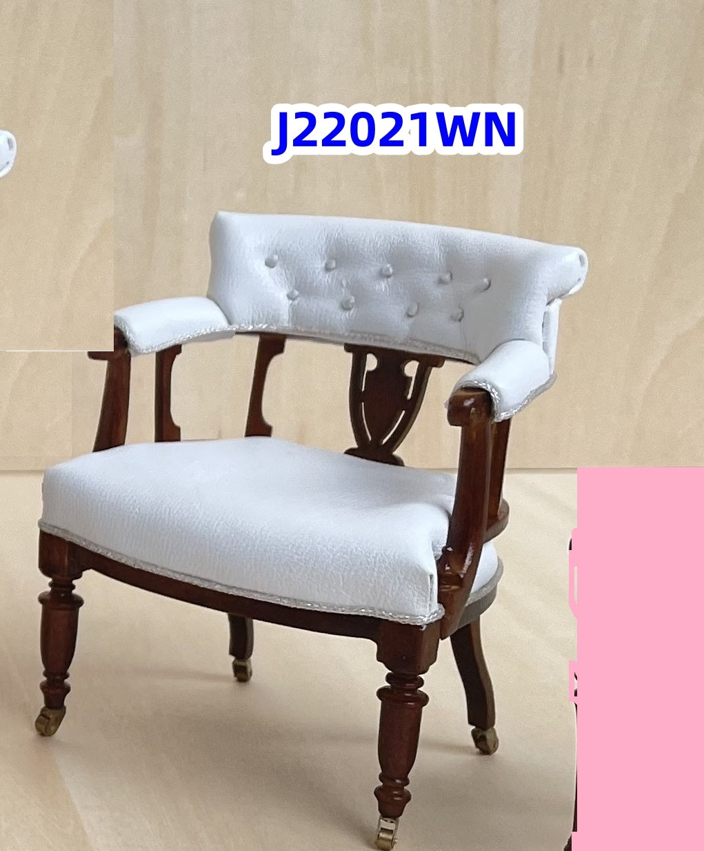 The arm chair has an elegant bow back shape upholstered with a white deep tufted fabric. The back of the chair has a carved vase shaped splat in the center and the rolled arms and seat are upholstered in the same white fabric . The four tapered legs are fitted with casters. Victorian coffee table with an oval shaped sculptured table top and four vase shaped Legs with ring turnings culminating in ring and ball pad feet.A central turned spindle matches the legs and sits at the junction of the x shaped spreader bars . The table apron is decorated with a carved motif on each side of the table.