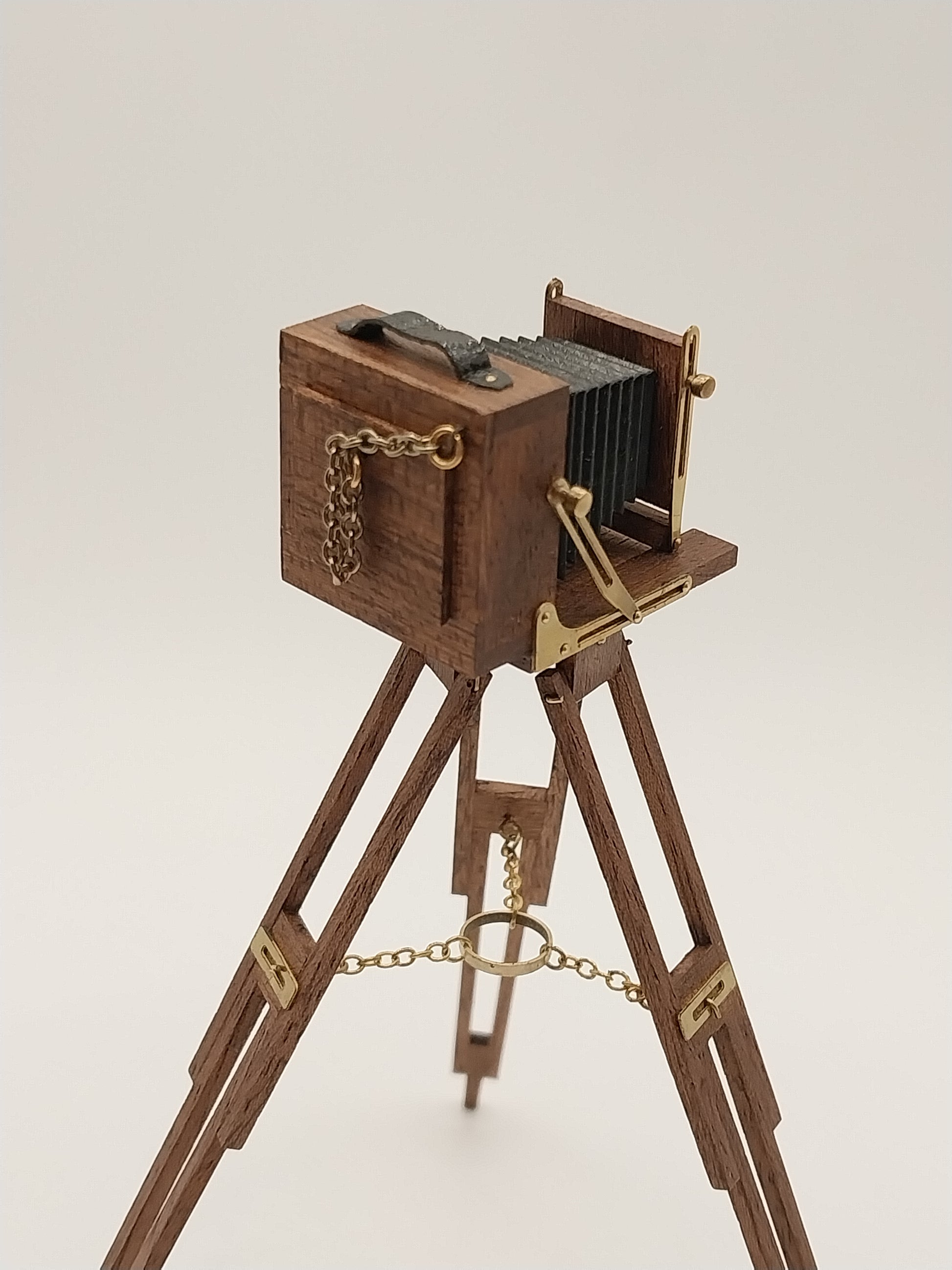 Handmade Sanderson Vintage Camera on a Tripod. Authentic walnut woods and brass are used to create this miniature replicate of the late F.H. Sanderson creator of the real life one in 1902. The camera also comes with a walnut handmade box and working latches on the box. Exquisitely made by Taller Targioni as always with his attention to detail.