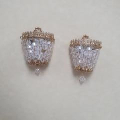 Wall fixture with strands of Austrian Crystals surrounding 2 bulbs. Bulbs are replaceable bi-pin. Fixture has a large crystal drop on the bottom. Sold individually.