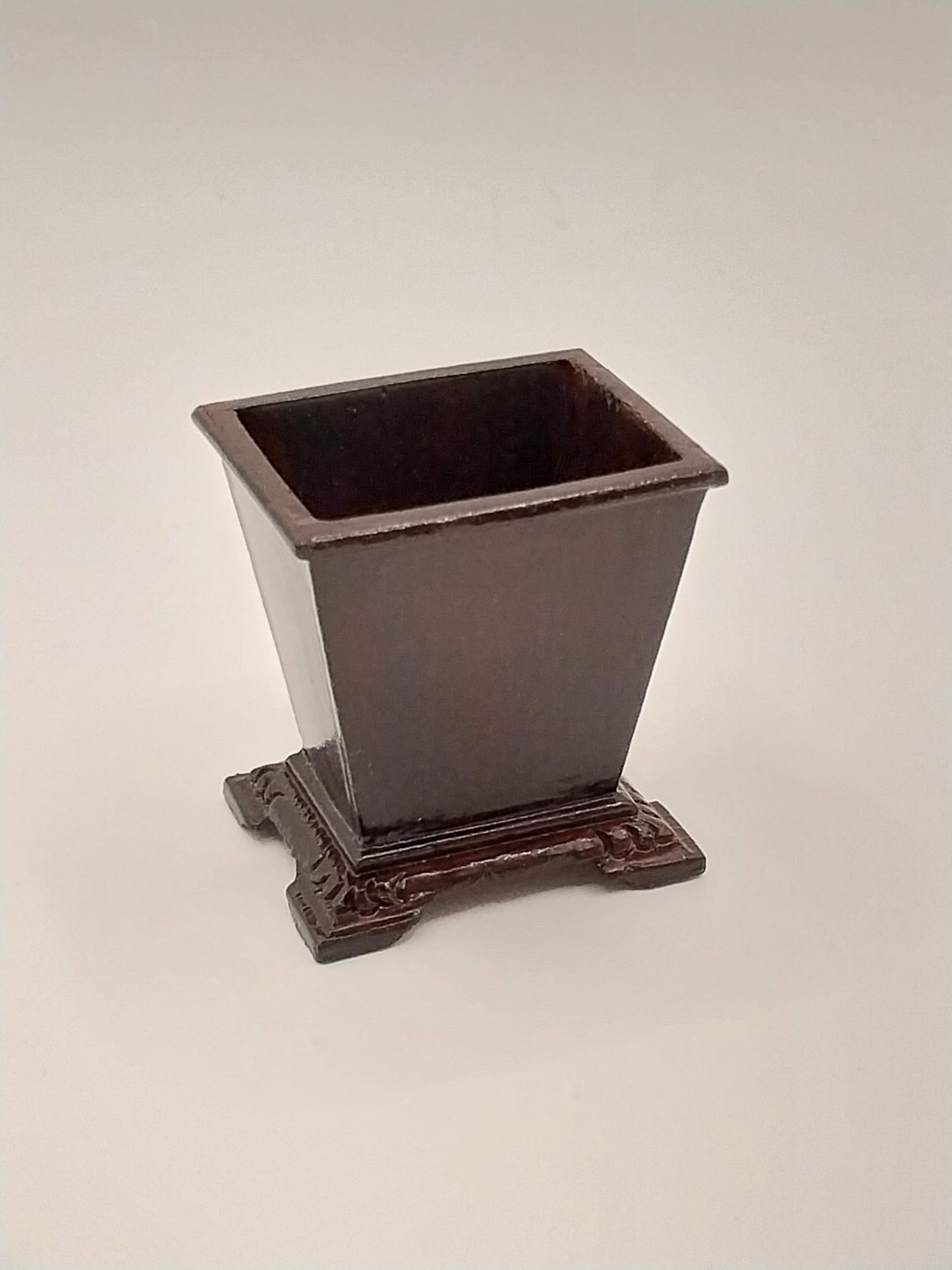 This Wastebasket is made by Bespaq and comes in a dark Mahogany finish.