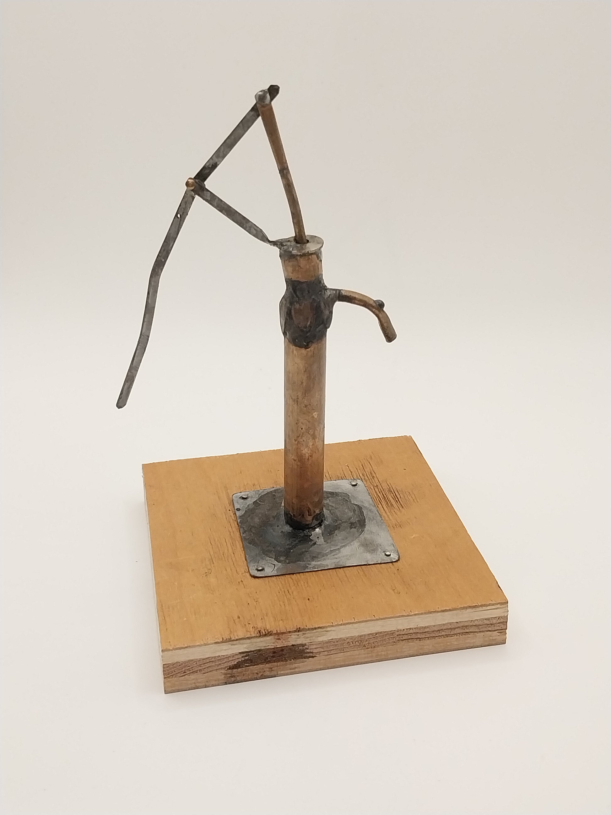 This Old Water Pump is handmade by Artisan Fred Cobbs. Pump is made of soldered metal and copper. Pump actually works. Piece is signed and dated by Artisan. Each Pump is hand made so Pumps will vary in style, size, and color