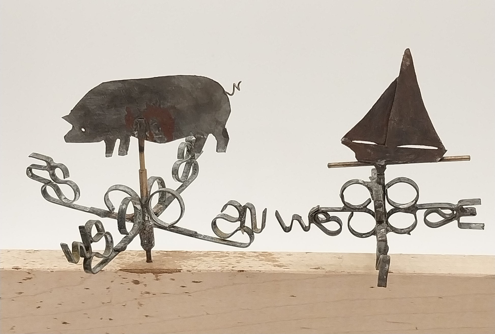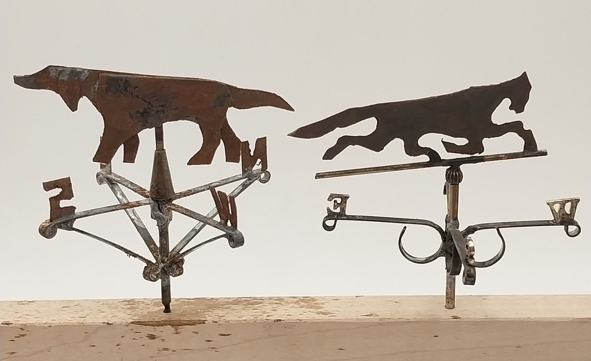 These Weather Vanes are hand made by Artisan Fred Cobbs. Each Weather Vane is unique in style, size, and color. They come in assorted themes. Each one is made of soldered metal and copper.