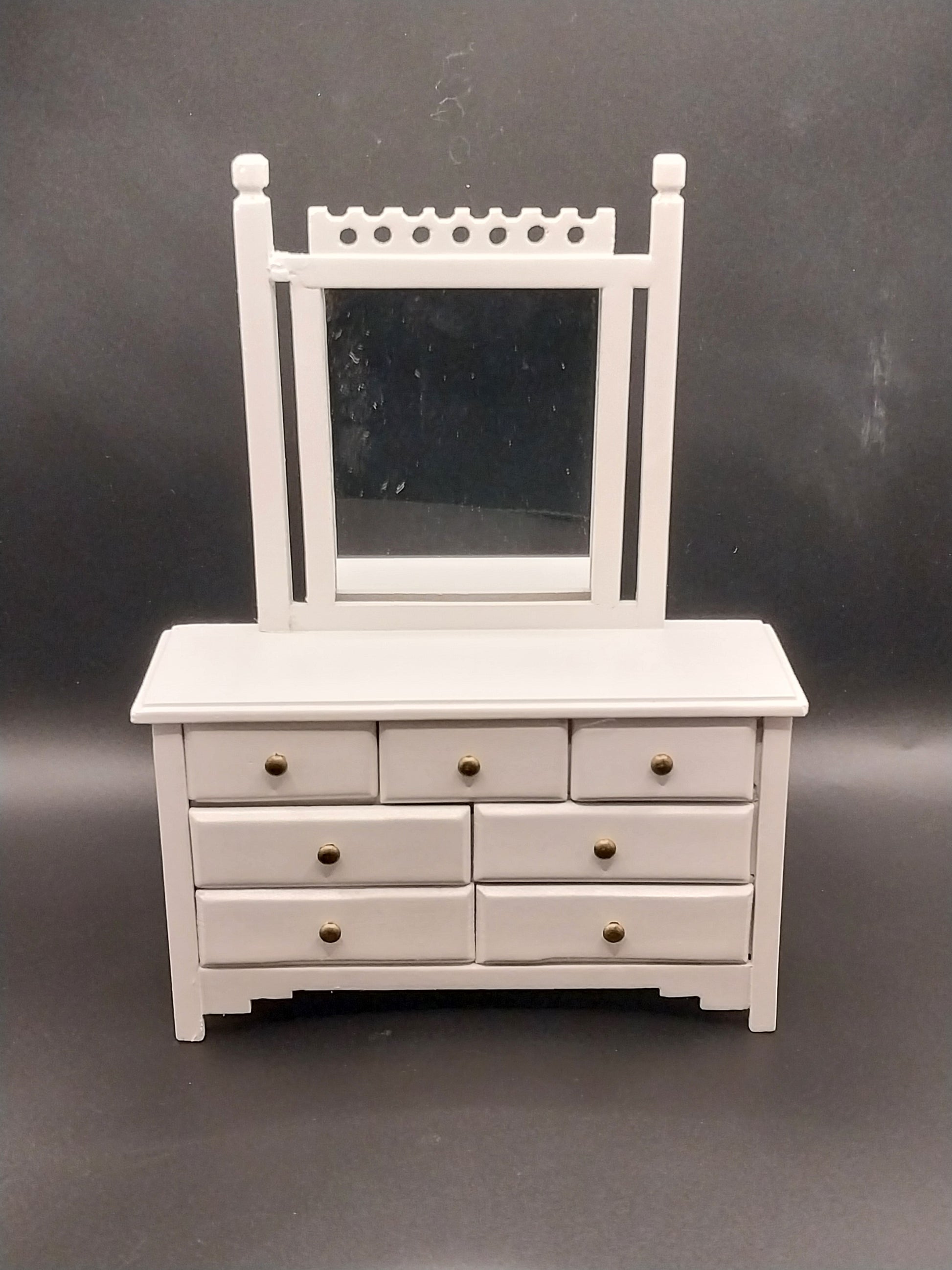 White Dresser with mirror, dresser has 7 working drawers with antique brass hardware. Mirror is fixed to dresser.