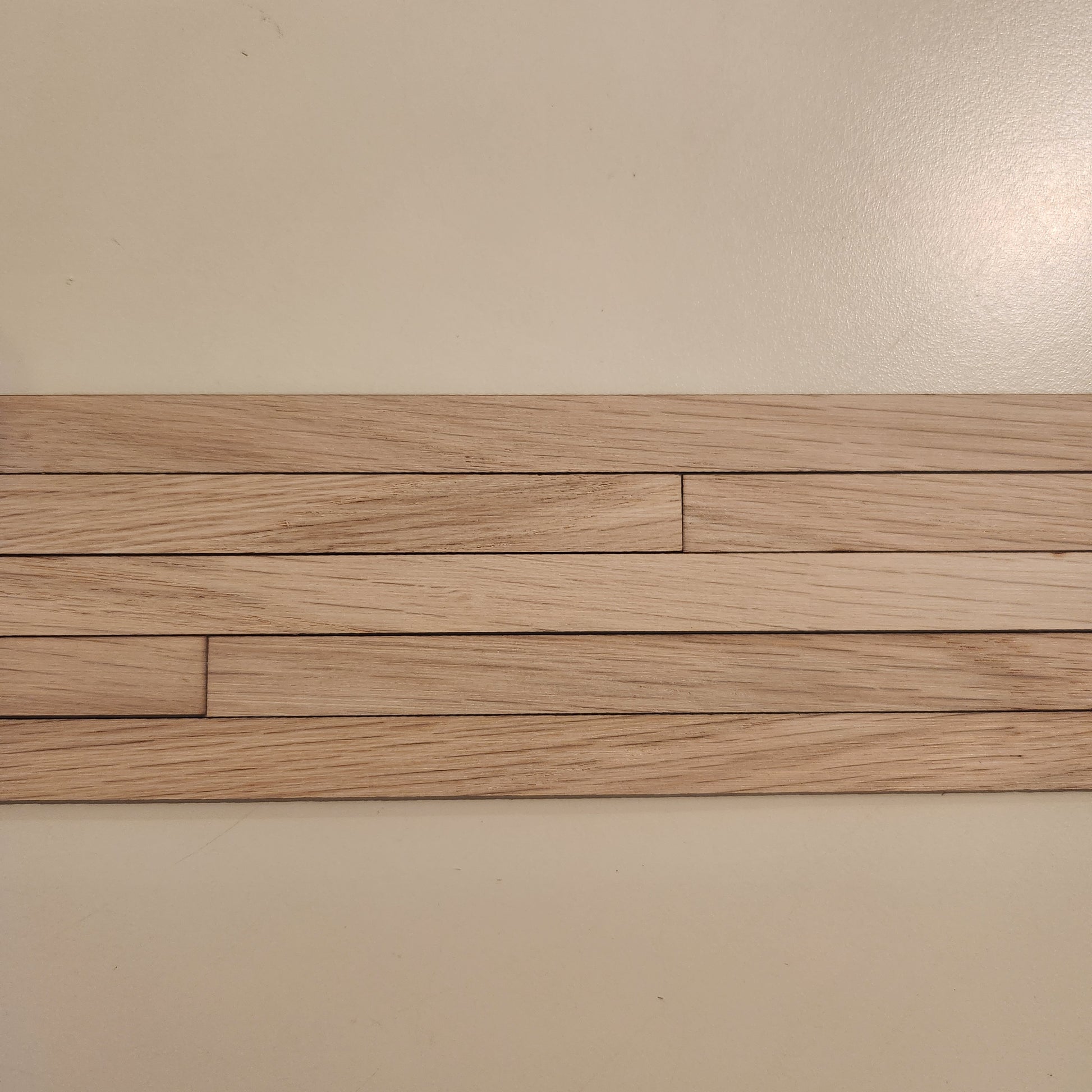 White Oak Hardwood Plank Flooring, all of our hardwood planks are precision milled from the highest quality materials available. This flooring is White Oak with a width of 3/8". All strips are 18" long and 1/16" thick. Each package covers 1 sq. ft.
