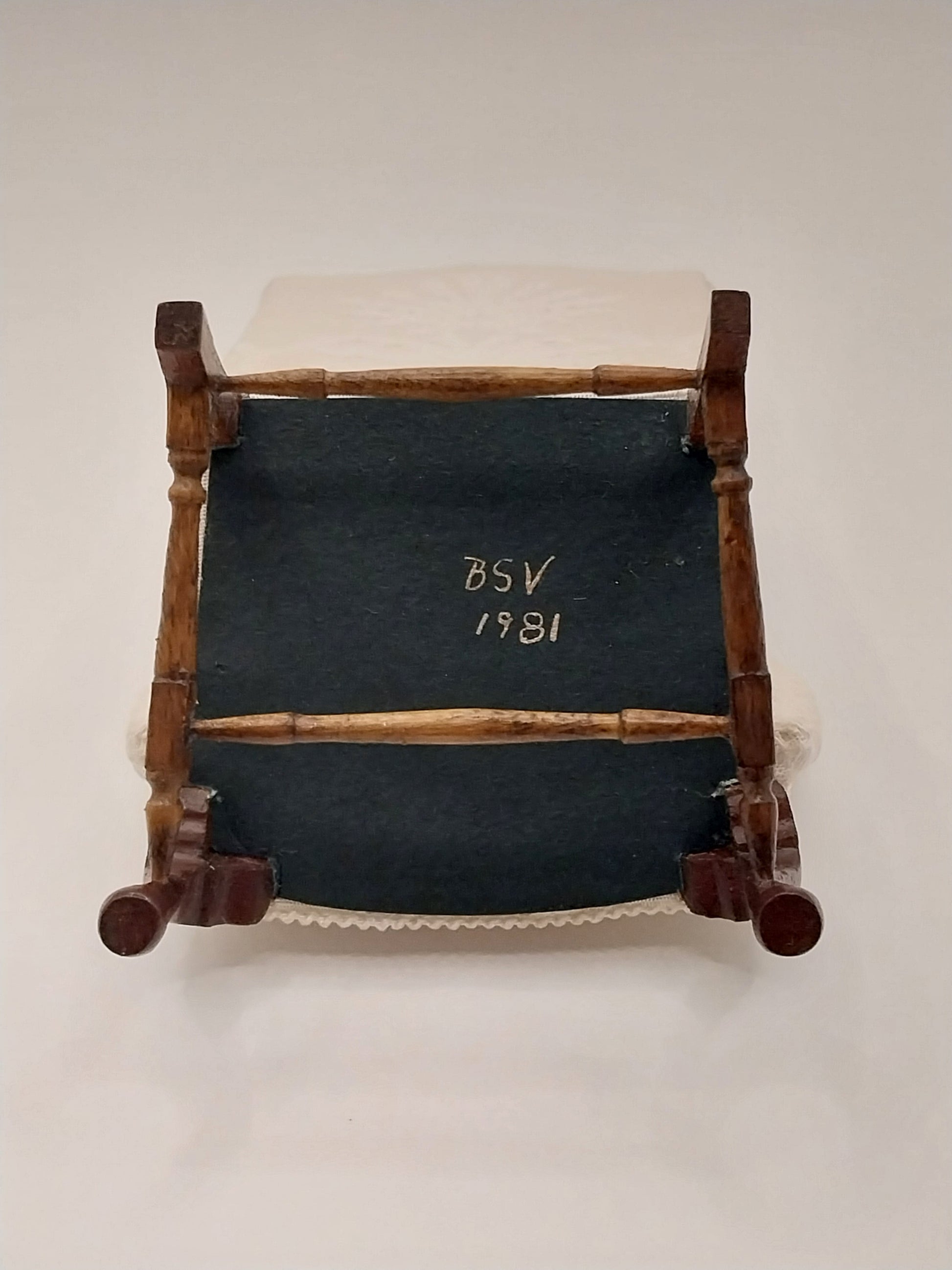 This Wing Chair is made by Artisan Betty Valentine, and comes in a Cream Brocade Fabric. Chair is signed and dated 1981 by Artisan.