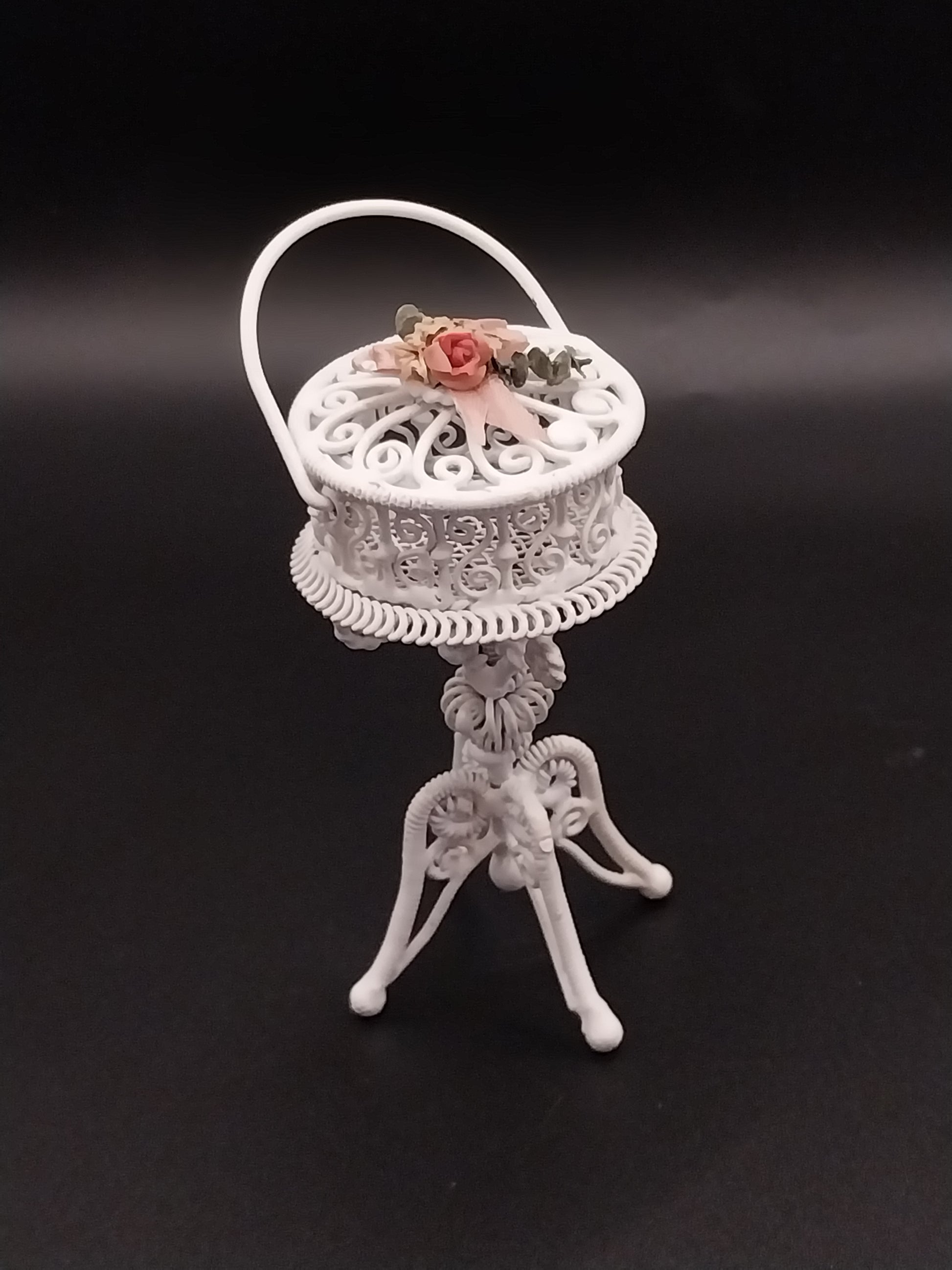 White Wire Wicker Sewing Basket, removable lid. Lid does have a pink floral swag with ribbon.