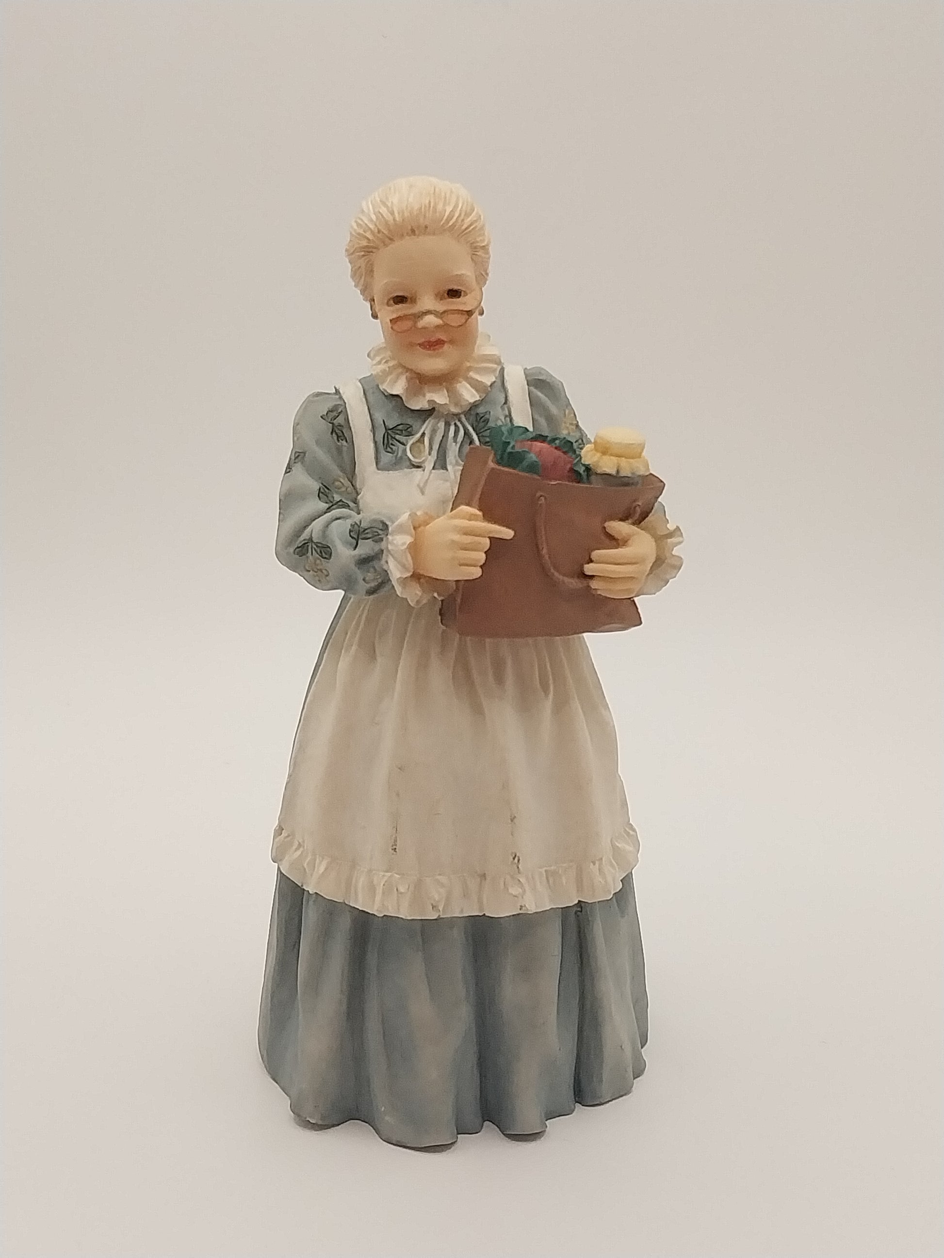 Victorian Grandma Doll holding a bag of groceries. She is made of Resin. She has a long blue dress with yellow floral print top and white apron. Has blonde hair pulled back in a bun and is wearing a pair of wire rim glasses.