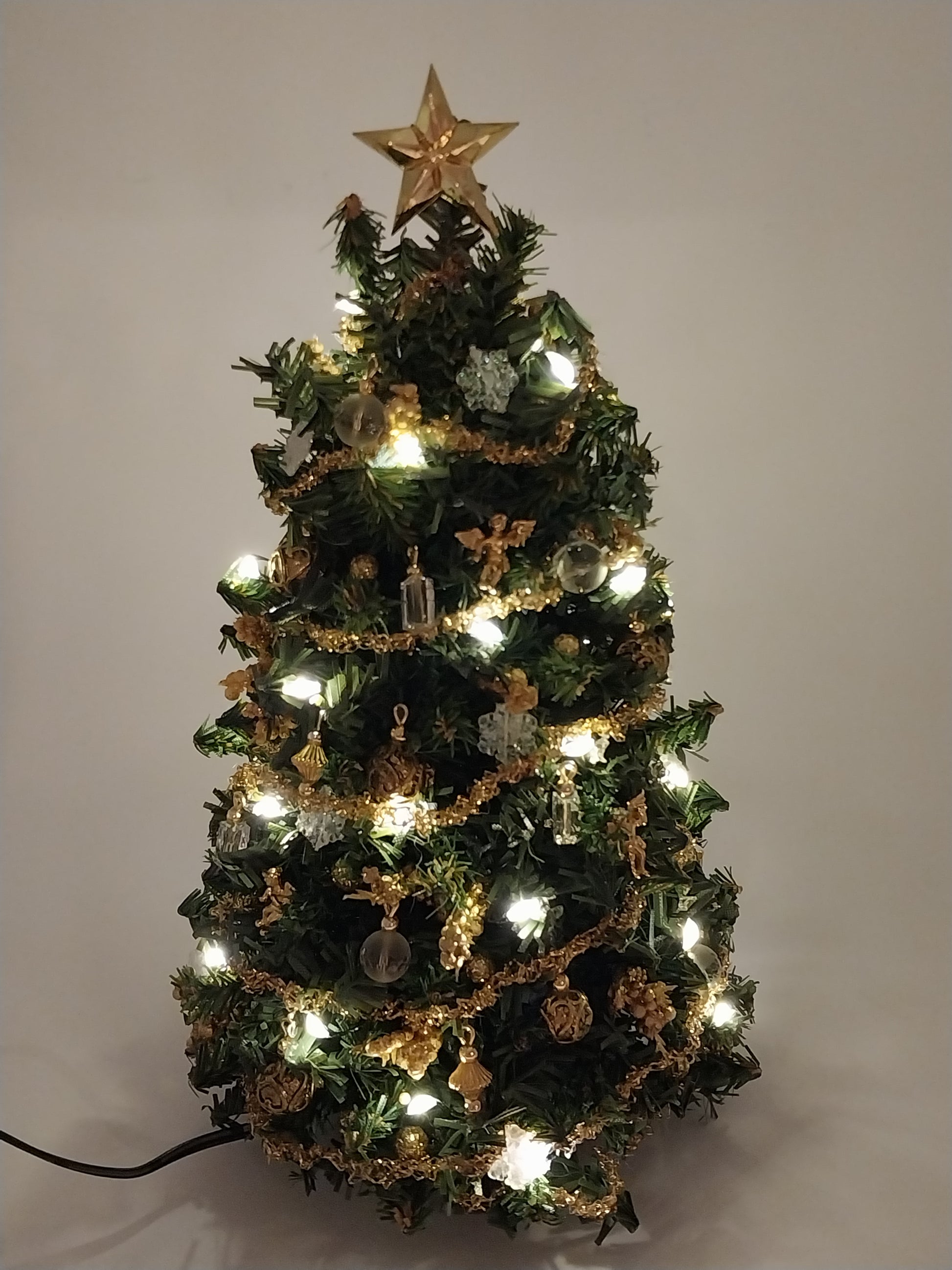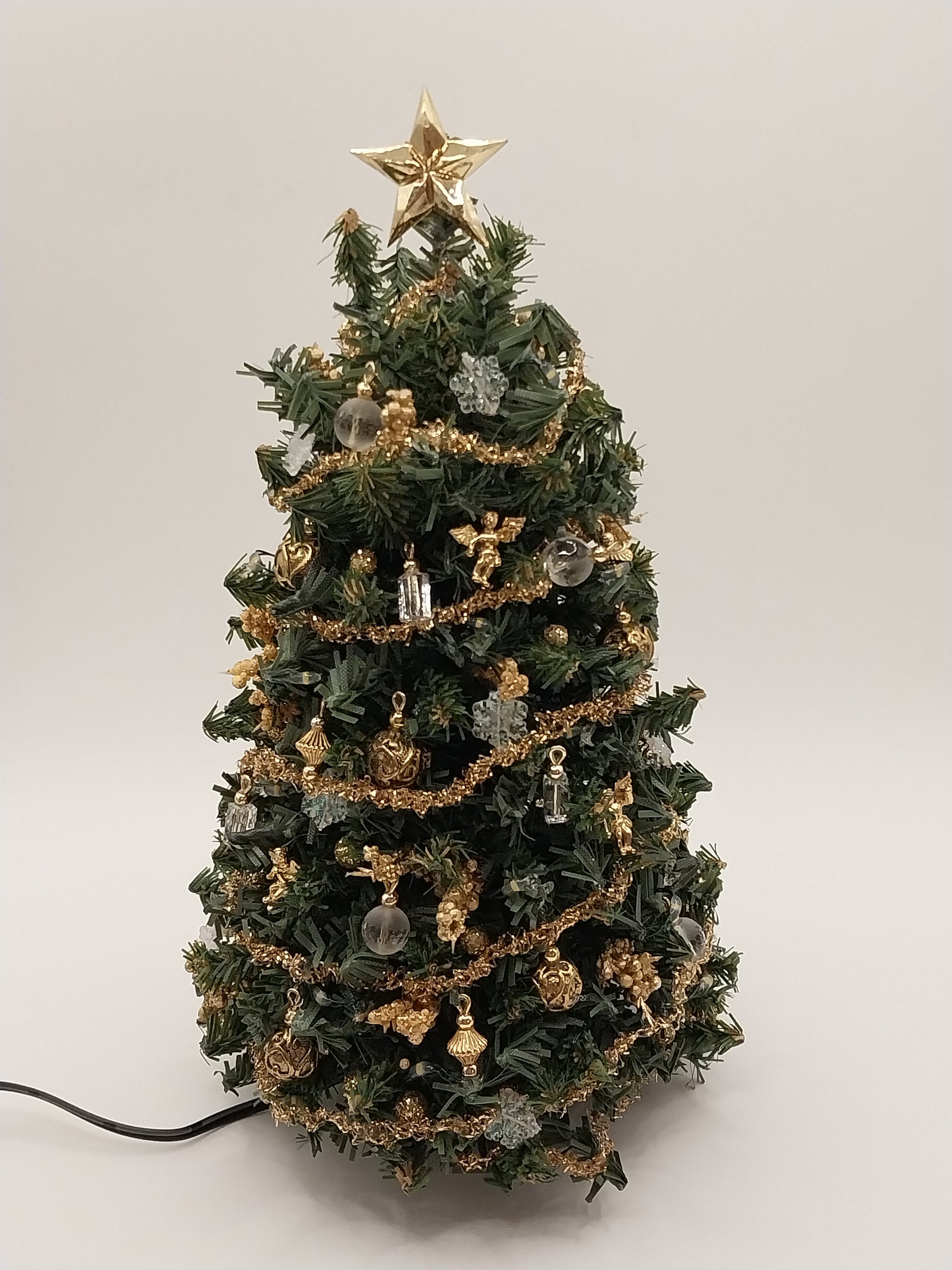 Handmade Christmas Tree comes with assorted Gold and Crystal ornaments with gold garland and gold star tree topper. Tree does have White lights that work with battery pack. White lights can be set to Fade in and out, Flashing, or Steady Lights. Batteries are included with Christmas Tree.